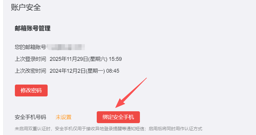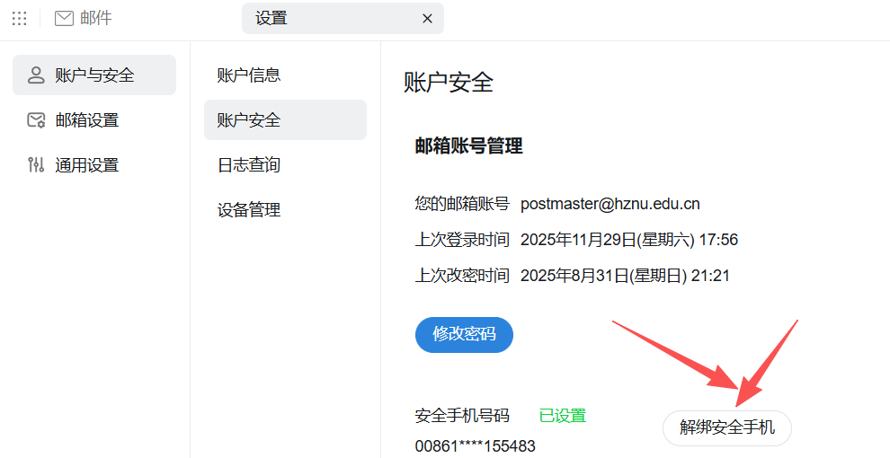 进入邮箱后台,点击右上角的【设置】,查看【更多设置】,进入之后点击【账户安全】,再点击【解绑安全手机】,根据提示输入验证码,然后重新绑定手机号。
