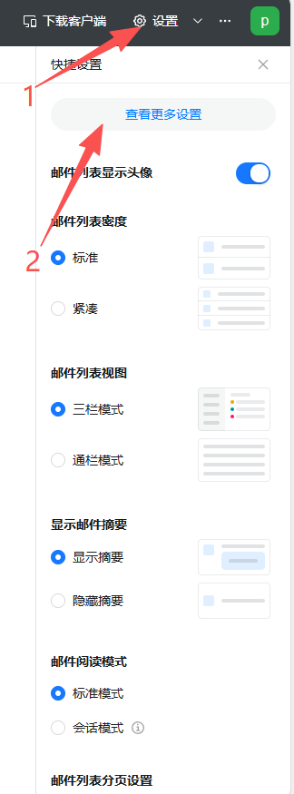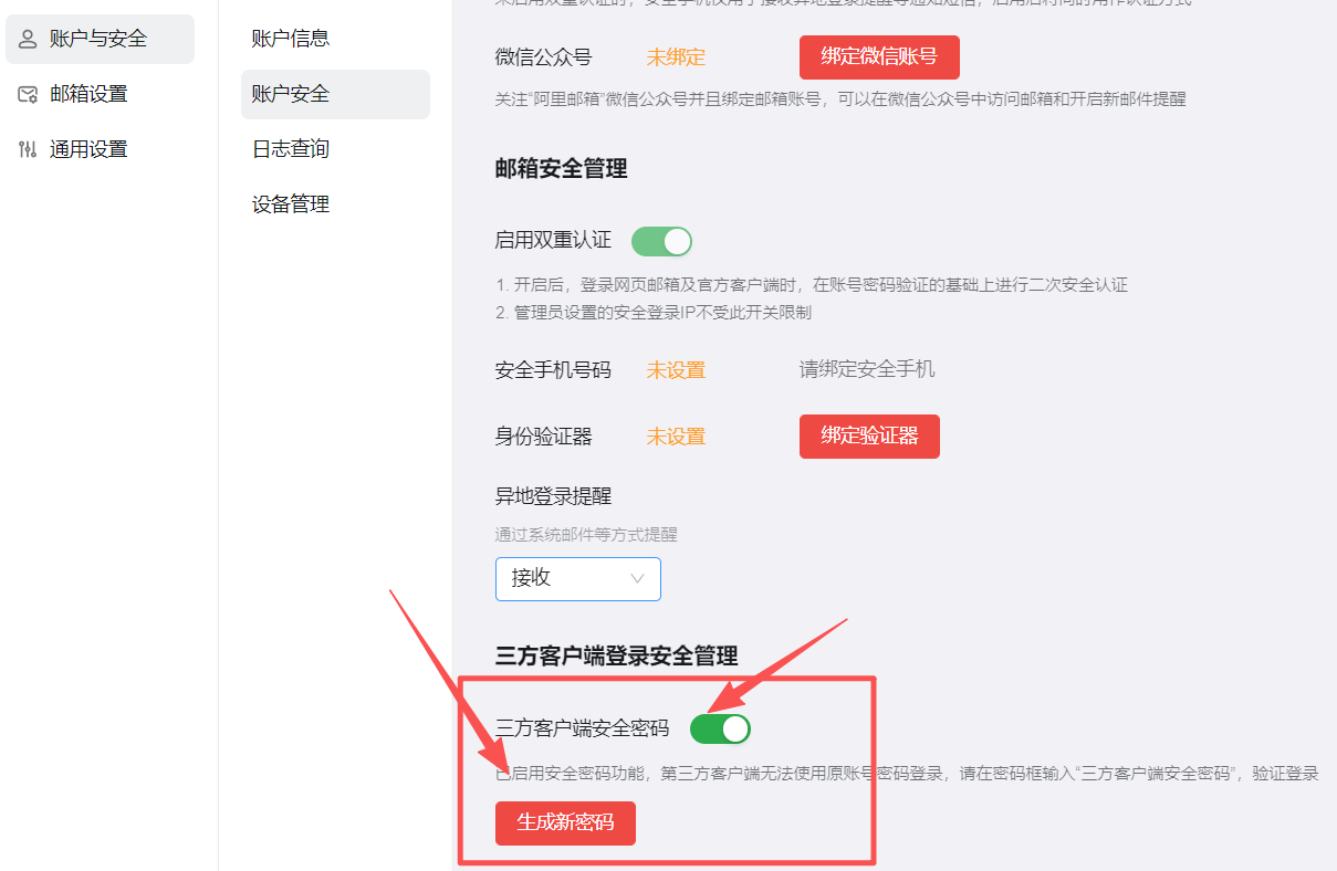 进入邮箱后台,点击右上角的【设置】,【查看更多设置】,进入之后点击【账户安全】,【三方客户端登录安全管理】,按钮点击开启。