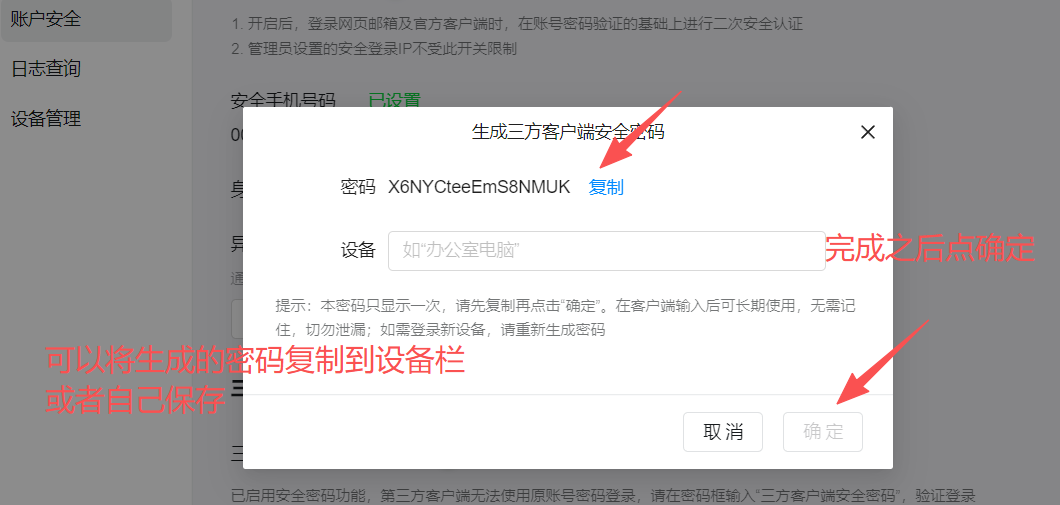 输入完验证码之后,会弹出三方密码的弹窗,该密码只会显示一次,需要先复制再点确定,可以将密码复制到设备栏以免忘记,或者自己保存,设置完成之后 需要点击【确定】,才算生成完成。