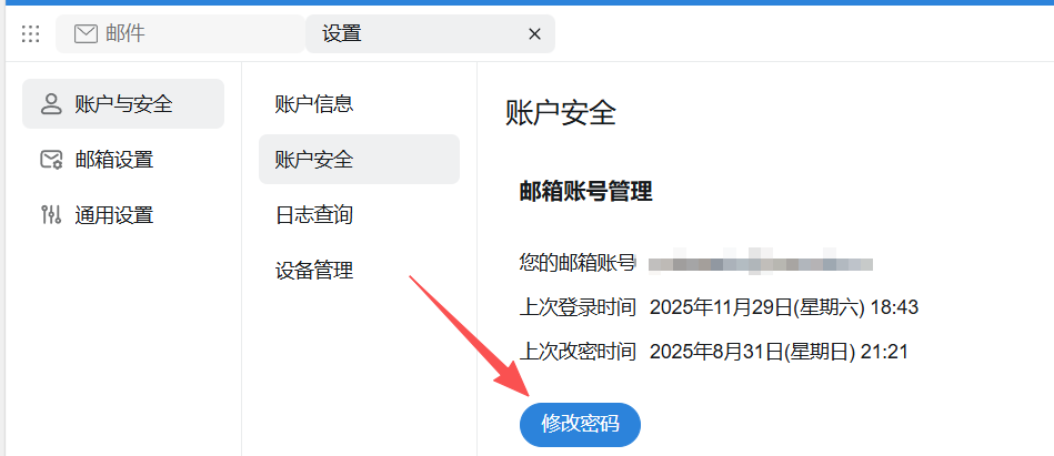 邮箱系统中,点击右上角的设置,查看更多设置,进入之后点击到账户安全,根据对应的提示操作,修改密码。