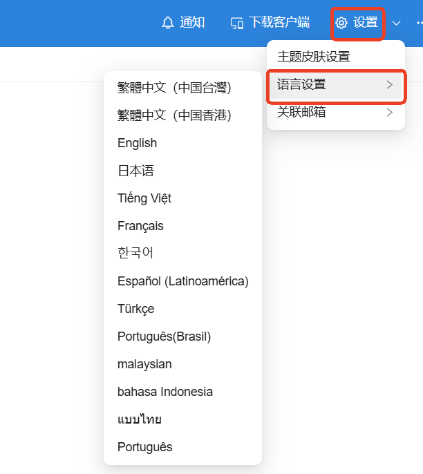 进入邮箱后台,点击右上角的【设置】→【语言设置】,切换邮箱系统语言。