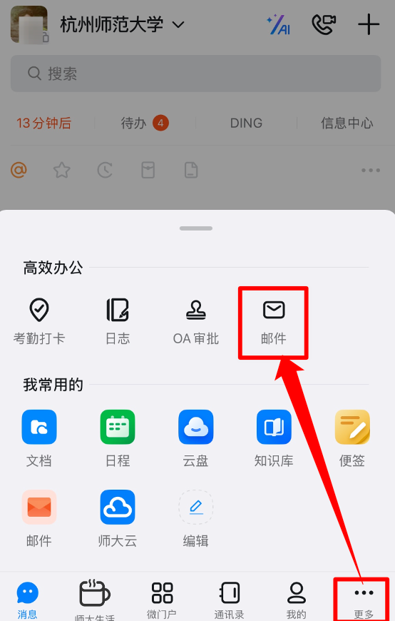 (3)手机端:点击智慧师大专属钉App【微门户】→【校园邮箱】应用,或 【更多】→【邮件】,免认证登录使用。