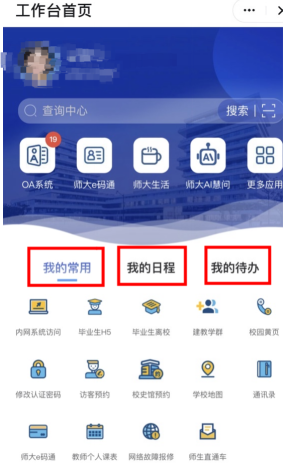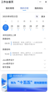 【我的日程】栏目会自动向教师推送当日授课安排、会议安排等日程;对学生而言,无需再反复翻找课表,打开 APP 就能清晰看到上课时间、地点,甚至还会同步讲座、活动等重要信息,告别“记不住日程”“找不到安排”的烦恼,让校园时间管理更高效、更省心。