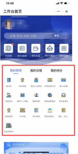 该栏目聚焦师生日常高频服务需求,将“修改认证密码”“访客预约”“师生直通车”等常用功能入口集中整合,直接呈现在微门户首页,有效避免用户在多级菜单中反复查找,显著缩短操作路径,提升办事效率。同时,栏目支持个性化定制,师生可根据个人使用习惯,自主添加、删除或调整“我的常用”应用的排序,让服务入口更贴合个人使用场景,实现便捷访问。